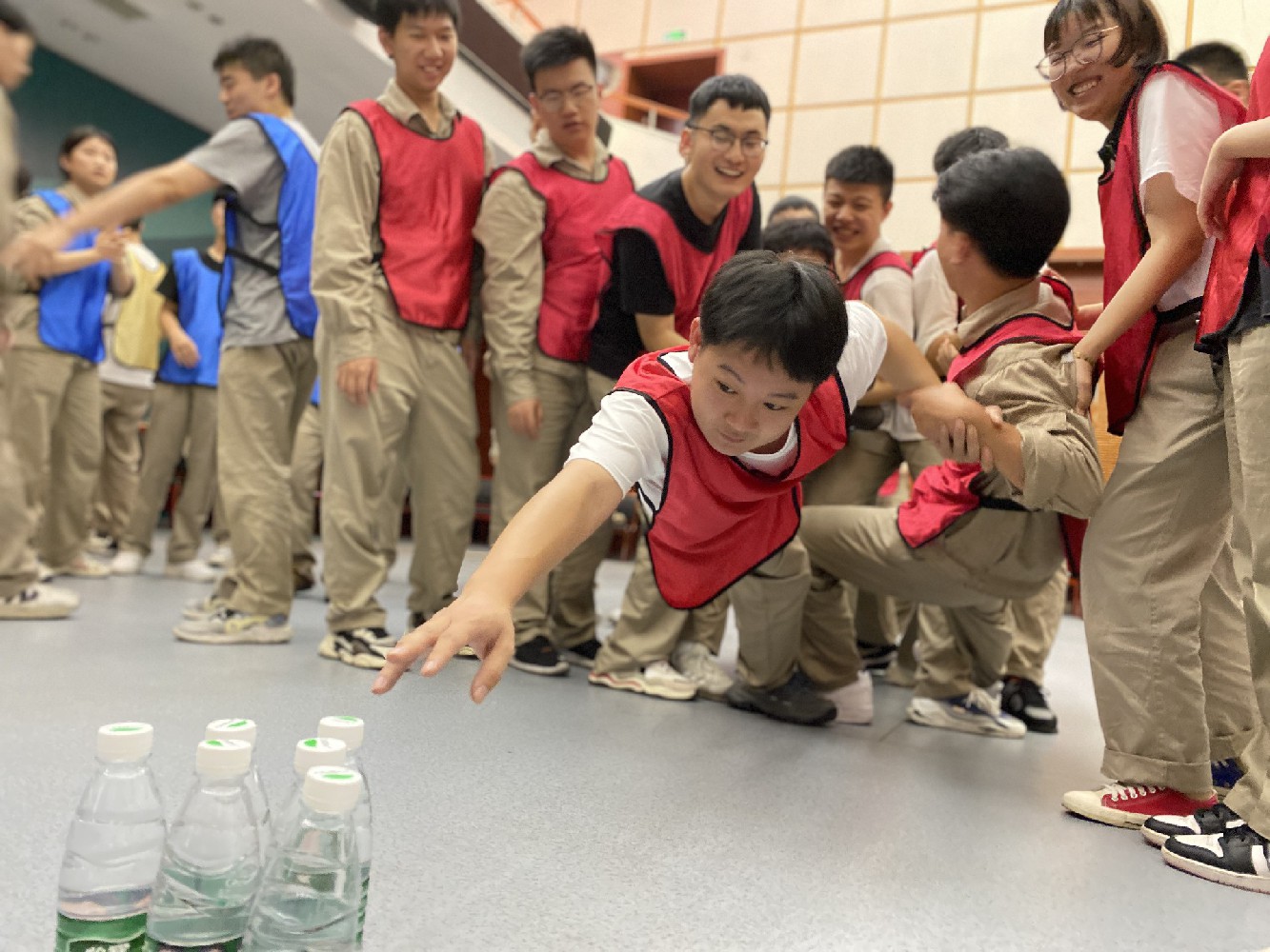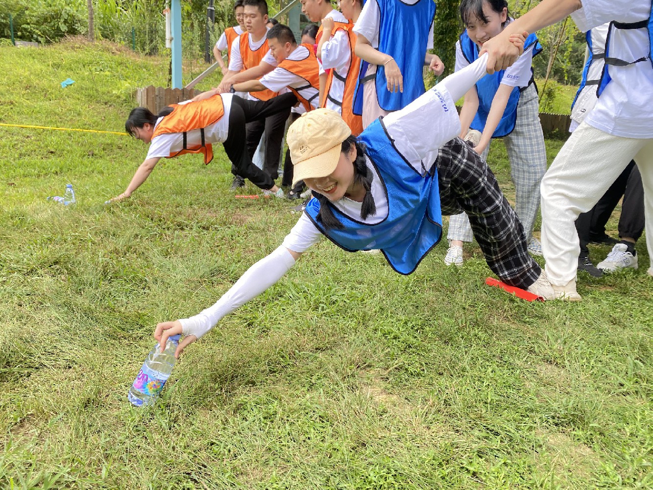 2、团队内每位成员都要取一瓶水,不得借助除身体外任何其他物品;